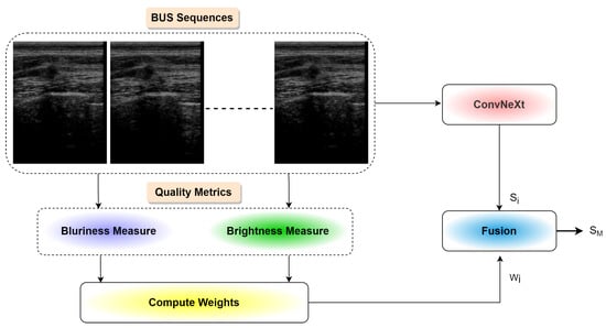 As discussed above, most studies did not consider the quality of BUS images when building the classification models. Furthermore, they employed a single BUS image to develop their methods. However, the noisy nature of BUS images and the significant similarity between normal and abnormal tissues make them difficult to recognize, causing incorrect diagnosis. In addition, dense breast fat and glandular tissue produce attenuation that affects ultrasonic waves and consequently degrades image quality. These issues represent a challenge to build a robust BUS image classification model. To handle these issues, this paper proposes an effective deep-learning-based radiomics method for breast cancer malignancy prediction from BUS sequences. To extract robust breast-tumor-relevant representations, we employ a deep learning architecture called ConvNeXt network. Unlike most existing work that employed a single BUS image for each tumor to build the classification model (i.e., SUI CAD system), we utilize BUS sequences. We also propose a malignancy score pooling mechanism that considers the BUS image quality when computing the final malignancy score of the whole sequence.