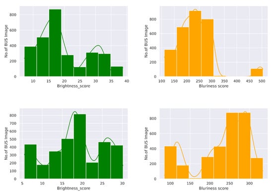 Brightness and blurriness scores analysis on the BUS sequence dataset. Top and below rows represent the benign and malignant classes, respectively. These plots were generated using the Python seaborn https://seaborn.pydata.org/ (accessed on 1 April 2022) and matplotlib https://matplotlib.org/ (accessed on 1 April 2022) libraries.