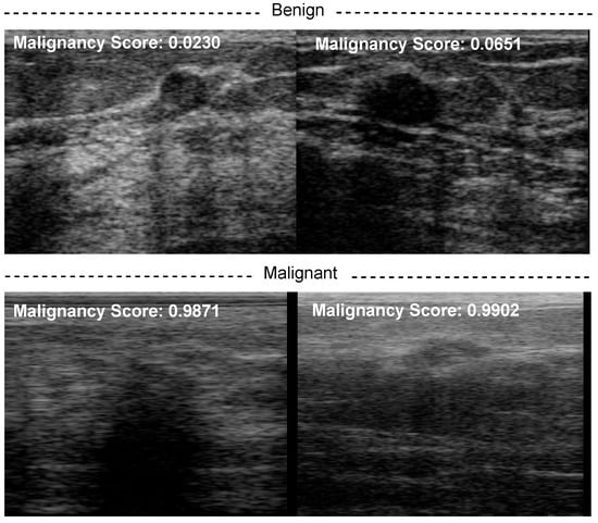 Figure 8 shows the malignancy scores of two BUS sequences having benign tumors (first row) and two BUS sequences having malignant tumors (second row). It should be noted that the malignancy score ranges from 0 to 1, where a malignancy score of 0 stands for no malignancy (i.e., benign tumors). As the malignancy score value approaches 1, the malignancy of the tumor increases. The proposed method obtains very low malignancy scores of and for the two benign tumors. In turn, the proposed method produces high malignancy scores for the two malignant tumors.
