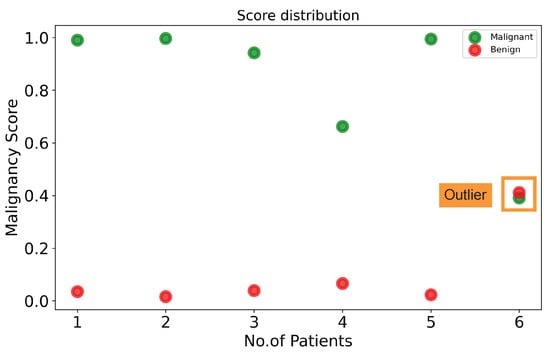Figure 10 visualizes the malignancy scores of the proposed method with BUS sequences of some patients. Given a BUS sequence fed to our method, if the malignancy score is higher than or equal to a threshold, the tumor is classified as malignant. If the malignancy score is lower than a threshold, the cancer is classified as benign. In our study, a threshold of 0.5 was used. As shown in Figure 10, five benign cases (marked by red dots) have low malignancy scores (<0.1), while four malignant cases (marked by green dots) have malignancy scores higher than . There are some outliers: one misclassified BUS sequence (marked by a square). An interesting observation is the malignancy scores of the misclassified BUS sequence are close to the threshold of . It should be noted that the threshold used to map probabilities to class labels can also be tuned to find the optimal value using a grid search algorithm, thus reducing the number of misclassified BUS sequences.