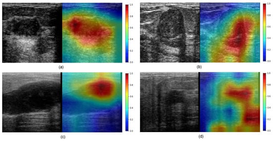 Figure 11 presents a visual interpretation of the proposed method using the Grad-CAM technique as explained in Section 3.3. As one can see, the pixels that highly contribute to the decisions of ConvNeXt (i.e., classifying tumors as benign or malignant) are highlighted in red, while the pixels that have a very low contribution to the decisions of ConvNeXt are highlighted in blue color. In the case of BUS images shown in Figure 11a–c, the red color in the two heatmaps is concentrated around the region of the tumors. In turn, in Figure 11d the red color appears in a shadow region as well as in the tumor region.