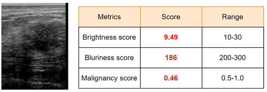 Indeed, the existence of dense breast fat and glandular tissue induces extended attenuation of the sent ultrasound energy; this attenuation is additionally combined through the inherent depth and frequency-dependent attenuation that affect waves in the ultrasonic settings. Because of this, the ultrasound image quality is reduced by high attenuation. This process results in a poor contrast-to-noise ratio (CNR) and SNR. This poor image quality creates issues for a clinician to precisely diagnose and curate them. Figure 10 shows the malignancy score analysis at the patient level. Each class includes six patients. A higher malignancy score confirms the patient’s tumor is malignant, otherwise it is benign. Figure 12 presents a malignant sample wrongly misclassified as benign, which produced a low malignancy score (0.46). As we can see, this BUS image has a limited quality as the brightness score (9.49) and the blurriness score (186) are lower than the predefined minimum thresholds, 10 for brightness and 200 for blurriness.