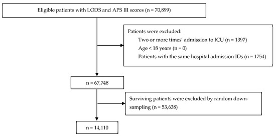 The inclusion criteria were patients admitted to the ICU for the first time who were older than 18 years. The first ICU admission was considered when a subject had multiple admissions to the ICU. The exclusion criteria were patients with admission to an ICU two or more times, patients younger than 18 years, and patients with the same hospital admission IDs. We did not exclude patients with any diseases, similar to the method used in previous studies [23]. Class imbalance is a major problem in ICU datasets, as the number of deceased patients (7055, 10.4%) is much lower than the number of living patients (60,693, 89.6%). Methods for dealing with datasets with class imbalance include resampling [24,25] and classifying cost functions [26]. Downsampling is a kind of resampling that entails decreasing the number of records in the majority class with more samples. We used random downsampling to randomly select the same number of positive samples as the negative samples from the original dataset of 60,693 patients [27]. After random downsampling, a total of 14,110 patients (7055 in-hospital deceased patients and 7055 surviving patients) were considered in the study. The sample size was sufficiently large, and no sample size calculation was undertaken. The flow chart of the study is shown in Figure 1. PostgreSQL was used to extract clinical information, including age, sex, weight, admission type, Logistic Organ Dysfunction Score (LODS), and Acute Physiology Score III (APS III) on the PostgreSQL database server (version 10).