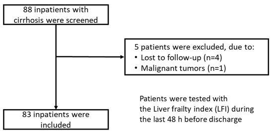 - Serper, M.; Tao, S.Y.; Kent, D.S.; Garren, P.; Burdzy, A.E.; Lai, J.C.; Gougol, A.; Bloomer, P.M.; Reddy, K.R.; Dunn, M.A.; et al. Inpatient Frailty Assessment Is Feasible and Predicts Nonhome Discharge and Mortality in Decompensated Cirrhosis. Liver Transplant. Off. Publ. Am. Assoc. Study Liver Dis. Int. Liver Transplant. Soc. 2021, 27, 1711–1722. [Google Scholar] [CrossRef]