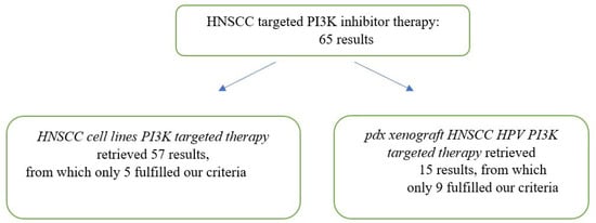 Literature search and study selection: a systematic search of the PubMed and the EMBASE databases was carried out for all the published studies on HNSCC in the last 5 years, using the following search algorithm: HNSCC HPV-positive PI3K-positive targeted therapy, HNSCC cell lines PI3K-targeted therapy, pdx xenograft HNSCC HPV PI3K-targeted therapy. We performed a systematic analysis for the studies that were published in English, from 1 January 2017 to 1 March 2022, and that described and analyzed the methods used for optimal targeted therapy of HNSCC patients. The 14 studies were blinded and analyzed by two persons (Figure 1). We excluded review papers and studies that have tested cell lines to other therapies except PI3K inhibitors.