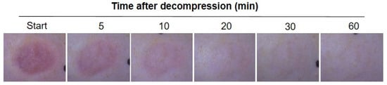 Representative macroscopic observation of blanchable erythema. The progress of erythema after decompression showed at the start and, 5, 10, 20, 30 and 60 min.