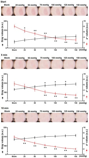Our study simulated the transparent disk method; the results obtained were in accordance with the definition of light pressure. However, macroscopic observations have some limitations. For example, the estimators cannot be used for comparison before and after and are also unreliable and hard to quantify [15]. Furthermore, we used a Dermo-camera to measure the gray values of the images and a spectrophotometer to measure the a* values. Based on previous clinical experience, the evaluator set the pressure to 150 mmHg for the transparent disc method [6]. In our animal experiments, the gray value and a* values showed that the pressure was in the range of 50–100 mmHg. In order to reduce secondary damage caused by inspections, pressures below 100 mmHg are more appropriate than 150 mmHg.