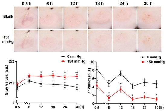 Macroscopic observation and quantification of the early PI. Macroscopic observations of the loaded area were taken 0.5, 6, 12, 18, 24 and 30 h after decompression. The pressure range of the transparent disc method went from blank and 150 mmHg. Representative pictures are shown in the top panel. The loaded area (gray value) was quantified using the Image J software and the erythema index was regarded as the a* value measured by the spectrophotometer. (bottom; n = 8 for each group; * p < 0.05, ** p < 0.01 vs. blank via 1-way ANOVA and Dunnett’s post hoc test).