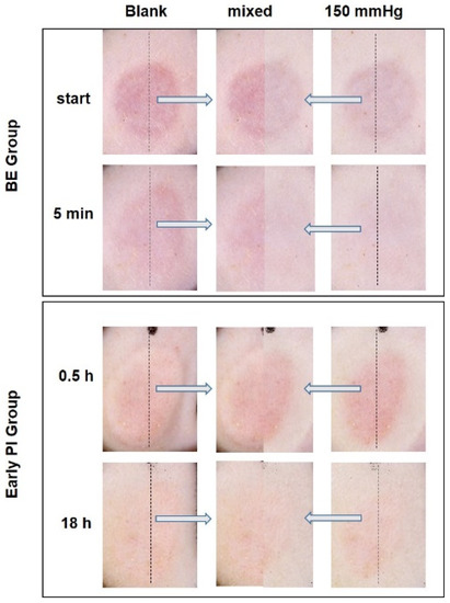 After decompression, BE remained when the transparent disc was applied, and it was visually non-blanchable (Figure 5, top), although the a* value indicated that the degree of reduction in the level of blanching was obvious (Figure 2, bottom). By contrast, the erythema of the early PI was lightest at 18 h after decompression (Figure 4) decreased significantly when the transparent disc was applied, and was visually blanchable (Figure 5).