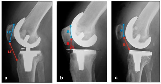 Measurement of patellar height with (a) Insall–Salvati Index (Quotient LT/LP), (b) Blackburne–Peel Index (Quotient B/A), (c) Caton–Deschamps Index (Quotient B/A).