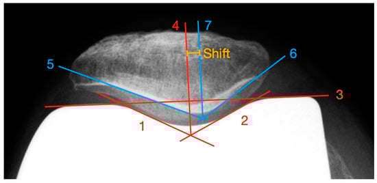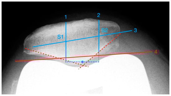 Deviations of the patella in the horizontal axis were measured using the patella tangential radiographs. The measurement of axial linear patellar displacement after TKA can be difficult, mainly due to the loss of the typical bony landmarks required for measuring patellofemoral congruence. In 2013, Metsna published the “Patellar Shift Index” [21], a new method to facilitate the measurement of patellar mediolateral alignment in relation to the trochlear groove after TKA (see Figure 2).
