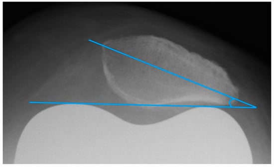 The patella tilt is believed to be involved in the development of anterior knee pain [9,14]. Grelsamer published a method for standardized measurement of the patellar tilt in 1992 [24]. On patella tangential X-rays, a line connecting the medial and lateral patellar poles is drawn and the angle between this line and a horizontal line is determined. However, this method is not very resistant to varying leg rotations. For this reason, the measurement of the patellar tilt according to Gomes [22] was used. It is largely similar to the method by Grelsamer, but instead of the horizontal it uses a line between the apices of the femoral condyles as femoral reference line (see Figure 4) [22]. Openings of the angle to the lateral are given with a positive sign, openings to the medial with a negative sign. Values up to ± 5° are considered to be normal [9].