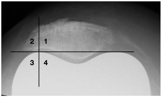 Osteophytes are one of the basic radiographic signs in osteoarthritis diagnostics [27]. During surgical joint replacement, osteophytes are usually removed. Left lateral osteophytes may lock and lead to compulsory guiding of the patella. This results in patellofemoral constraint, which is a common cause of functional limitations and postoperative pain in the femoropatellar joint [11]. A quadrant model was used to classify the lateral bony attachments (see Figure 7). The horizontal division is made at the level of the apices of the femoral condyles. The vertical dividing line runs through the center of the lateral femoral condyle.