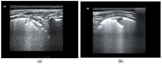 The pulmonary ultrasound shows compact B artifacts creating the image of white lungs with many subpleural consolidations. (a) posterior part of the right lung (b) the rear part of the left lung.