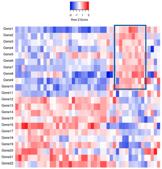 An example of gene expression profiling comparing the relative gene expression levels and grouping of cases by clusters. For example, the indicated boxed area indicates that Genes 1–10 have a relative increase in expression, thereby potentially clustering cases together for classification purposes.