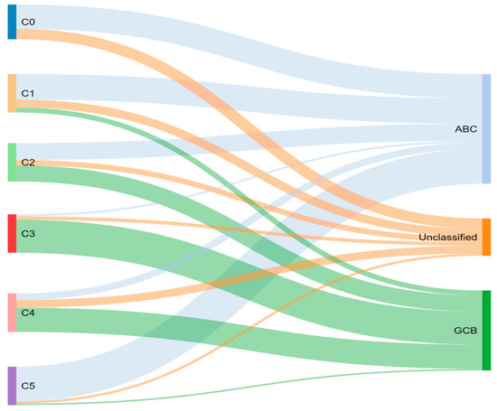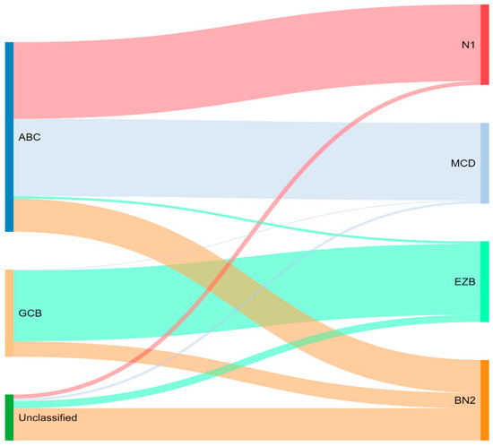 Through previously mentioned genomic methods, Chapuy et al. [15] utilized clustering analytic methods to identify low-frequency alterations, captured recurrent mutations, somatic copy number alterations, and structural variants, and created five differential genetic signatures to further subtype DLBCL (Figure 2). C1 was ABC-related, associated with NOTCH2 mutations and favorable outcome; C2 was unrelated to GCB and ABC, had frequent biallelic TP53 inactivation, CDKN2A deletion, and poor outcomes; C3 was GCB-related, associated with BCL2 translocation, PTEN aberrations, epigenetic modifiers (KMT2D, CREBBP, and EZH2) and unfavorable outcome; C4 was GCB-related, with BCR–PI3K, NF-κB, or RAS–JAK signal transducer, was an activator of transcription (BRAF and STAT3) pathway aberrations, histone gene mutations, cluster of differentiation proteins associated with immune evasion (CD83, CD70, and CD58), and had favorable outcomes; C5 was ABC related, gained BCL2, MYD88L265P, CD79B, PIM1, and PRDM1 mutations, and had unfavorable outcome. The prognostic capability of the subtypes was also independent of the clinical gold standard IPI [15].