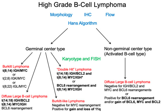 - Bergman, C.C.; Cuillière-Dartigues, P.; Baia, M.; Briere, J.; Delarue, R.; Canioni, D.; Salles, G.; Parrens, M.; Belhadj, K.; Fabiani, B.; et al. MYC-IG rearrangements are negative predictors of survival in DLBCL patients treated with immunochemotherapy: A GELA/LYSA study. Blood 2015, 126, 2466–2474. [Google Scholar] [CrossRef]