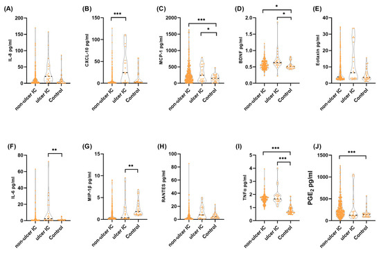 - Tyagi, P.; Killinger, K.; Tyagi, V.; Nirmal, J.; Chancellor, M.; Peters, K.M. Urinary chemokines as noninvasive predictors of ulcerative interstitial cystitis. J. Urol. 2012, 187, 2243–2248. [Google Scholar] [CrossRef]