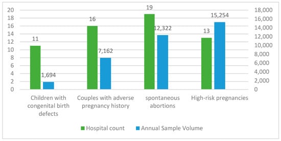 In March 2020, we designed an online questionnaire (https://www.wenjuan.com/s/nY3MFf2/, accessed on 31 March 2020) and aimed to study the current practices of accredited laboratories, service quality, and case volumes of low-pass WGS-based CNV analysis among Chinese tertiary hospitals. Tertiary hospitals in China refer to a general hospitals that usually have a full complement of services and a higher level of specialized care such as prenatal diagnostic services. It is usually a university-affiliated hospital or women and children’s specialist center, which are equipped with certified prenatal diagnostic laboratories. The inclusion criteria were: Chinese tertiary hospitals that have routinely applied low-pass WGS for more than a year and have been certificated in NGS-based genetic test services for more than three years. For each hospital, one coordinator was assigned as a key informant and was responsible for returning the information from the questionnaires. Participants were required to respond based on their routine diagnostic laboratory practices and data audited in a 12-month period from February 2019 to January 2020. All participants took this opportunity to form the Chinese Genomic Structural Variants Consortium, a working group focusing on improving the quality of service of genome-sequencing-based structural variants detection (including CNVs). In this study, we focused on low-pass WGS for CNVs analysis and did not include the NIPT application. Therefore, hospitals that only applied low-pass WGS for NIPT were excluded from this study.