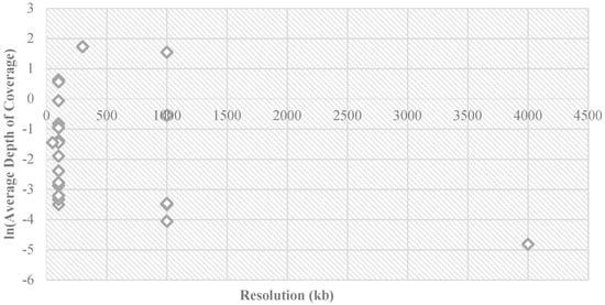 Sequencing parameters used by 21 Chinese tertiary hospitals in this survey. The average depth of coverage (ln value) varied across different reported detection limits for CNV size detection (resolution). Taking the resolution of 100 kb as an example, the average depth of coverage ranged from 0.03 (ln −3.5 in the figure) to 1.88 (ln 0.6 in the figure).