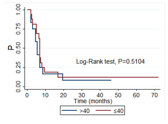 Kaplan–Meier 30 months progression survival curves of grade IV glioma patients according to sHLA-G, patients with sHLA-G < 40 (n = 17), patients with sHLA-G > 40 (n = 12), X-axis—progression-free survival time in months, Y-axis—survival probability in months without progression (test: Log rank p = 0.5104).