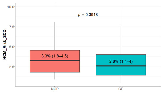 HCM risk score (hypertrophic cardiomyopathy European Society of Cardiology risk score) in NCP (nonclassic phenotype) and CP (classic phenotype) patients. Data presented in boxplot as median values, interquartile range, and minimal and maximal values.