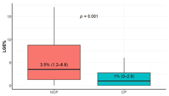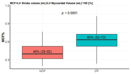 The NCP patients had significantly lower values of MCF (Figure 6). Both groups had values much lower than the reference given in [21], that is, 136.3 ± 24.4%. The median LVGFI in the NCP group was 26 (IQR 19–31) compared to 41 (IQR 36–45) in the CP group, p < 0.0001.