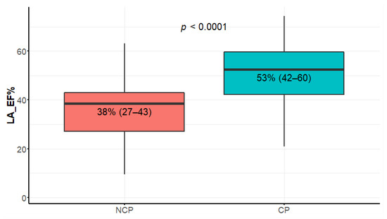 The differences in LAVmax, LAVI, and LAA between the NCP and CP patients were not statistically significant. In contrast, the LAEF difference was strikingly significant (Figure 7). The minimal volume (LAV min), area (LAA), and length (LAL) atrial parameters were also significantly different (Table 1).
