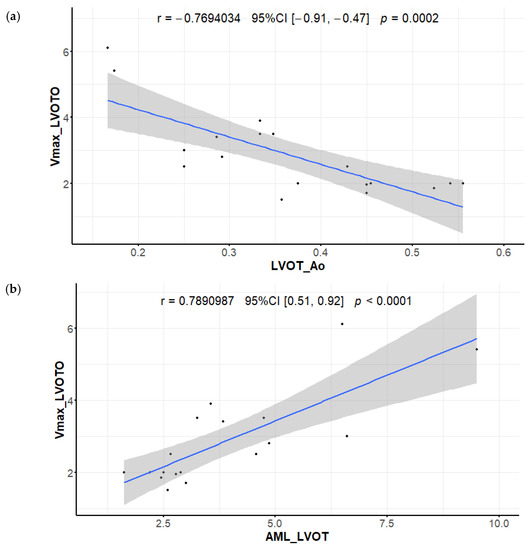 Correlation between maximal velocities measured in left ventricular outflow tract (m/s) and (a) the LVOT/Ao (left ventricular outflow tract diameter/aortic valve diameter) ratio; (b) the AML/LVOT (anterior mitral leaflet length/left ventricular outflow tract diameter) ratio.