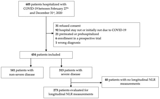 A total of 605 patients with laboratory-confirmed SARS-CoV-2 infection were treated at City Hospital Zurich Triemli Switzerland between 27 February and 31 December 2020. In total, 454 patients were included in our study. Of the patients, 313 (68.9%) were classified as severe cases, and 141 (31.1%) as non-severe cases. A total of 273 (87.2%) of the severe cases were evaluated for longitudinal NLR measurement. Details are provided in Figure 1.