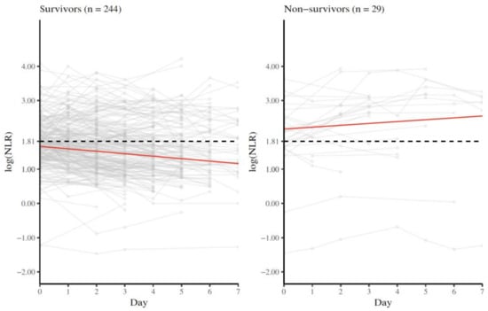 A total of 273 patients with severe disease were evaluated for longitudinal NLR measurement. In total, 244 (89.4%) patients survived and 29 (10.6%) died. The median intercept of log (NLR) was <1.81 in survivors and >1.81 in non-survivors. This threshold of log (NLR) 1.81 (equivalent to NLR 6.11) was chosen as suggested by Cai and coworkers, showing that a NLR > 6.11 was associated with an increased risk for mortality [15]. The median slope of log (NLR) revealed a reduction of −0.07 per day in survivors and an increase of 0.05 per day in non-survivors. Trajectory plots are shown in Figure 2. Individual slopes are shown in Figure S1.