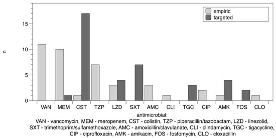 Antimicrobial susceptibility and resistance of K. pneumoniae NDM strains isolated from urine samples of all 23 patients were presented in Table 2. The most frequently administered antimicrobial agent was colistin (18/23, 78.26%), followed by meropenem (11/23, 47.83%), vancomycin (11/23, 47.83%), ceftriaxone (8/23, 34.78%), linezolid (7/23, 30.43%), piperacillin/tazobactam (7/23, 30.43%), trimethoprim/sulfamethoxazole (7/23, 30.43%), amikacin (5/23, 21.74%), amoxicillin/clavulanate (3/23, 13.04%), tigecycline (3/23, 13.04%), ciprofloxacin (2/23, 8.70%), fosfomycin (2/23, 8.70%), clindamycin (1/23, 4.35%), and cloxacillin (1/23, 4.35%). Fluconazole was administered in 14 of 23 patients (60.87%), and micafungin was administered in 2 of 23 patients (8.70%). In one case (4.35%), antimicrobial therapy was not administered. The detailed information on the antimicrobials administered in empiric and targeted therapy is shown in Figure 1.
