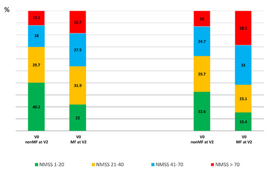 Compared with those patients who did not develop MF from V0 to V2, at V0, patients who presented with MF at V2 were younger (60.75 ± 9.06 vs. 63.41 ± 8.46 years old; p = 0.012), had a longer disease duration (5.36 ± 3.51 vs. 3.65 ± 3.09 years from symptoms onset; p < 0.0001); were receiving more dopaminergic medication; and had a worse status in terms of motor symptoms, NMS, QoL, and autonomy for ADL (Table 1). The mean NMSS total score at baseline was higher in those patients who developed MF after the 2-year follow-up than in those who did not develop MF (46.34 ± 36.48 vs. 34.3 ± 29.07; p = 0.001) (Table 1 and Figure 1). At V0, the frequency of severe and very severe NMS burden was higher in those patients who developed MF at V2 compared with those who did not (27.5% vs. 18% and 18.7% vs. 12.1%, respectively; p = 0.011) (Figure 2).