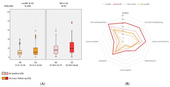 (A) QoL (PDQ-39SI) (y-axis) at baseline (V0) and after a 2-year follow-up (V2) (x-axis) in PD patients who developed MF at V2 (MF at V2 (PD-MFV2); N = 91) and those patients who did not developed MF at V2 (nonMF at V2 (PD-nonMFV2); N = 239). PDQ-39SI at V0, PD-MFV2 vs. PD-nonMFV2, p < 0.0001; PDQ-39SI at V2, PD-MFV2 vs. PD-nonMFV2, p < 0.0001; change in the PDQ-39SI from V0 to V2 in PD-MFV2, p < 0.0001; change in the PDQ-39SI from V0 to V2 in PD-nonMFV2, p < 0.0001; comparison between the change in the PDQ-39SI from V0 to V2 in PD-MFV2 vs. PD-nonMFV2, p = 0.005. (B) Mean score on each domain of the PDQ-39SI at V0 and at V2 in both groups, PD-MFV2 and PD-nonMFV2. At V0, the difference was significant between both groups in all domains (p values from 0.023 to <0.0001) except in PDQ-39SI-4 (Stigmatization) (p = 0.169) and PDQ-39SI-6 (Cognition) (p = 0.097). At V2, the difference was significant between both groups in all domains (p values from 0.005 to <0.0001) except in PDQ-39SI-6 (Cognition) (p = 0.319). PDQ-39 is expressed as a Summary Index (PDQ-39SI). Data are presented as box plots, with the box representing the median and the two middle quartiles (25–75%). p values were computed using the Kolmogorov–Smirnov, Mann–Whitney, and Wilcoxon tests. Mild outliers (O) are data points that are more extreme than Q1 − 1.5 * IQR or Q3 + 1.5 * IQR.