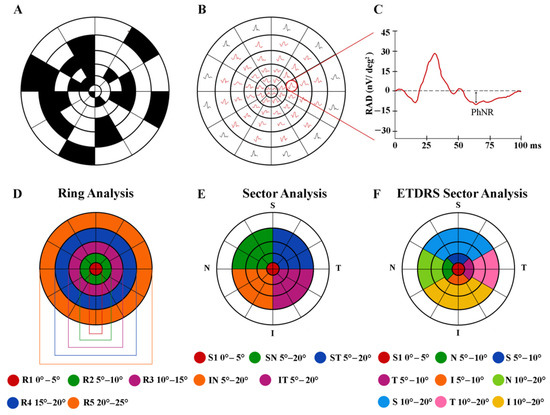 (3) The ETDRS sector analysis, based on the potential correlation of mfPhNR data with morphological outcomes on the density of RGCs at the posterior pole by applying the common Sd-OCT segmentation analysis [46,53].