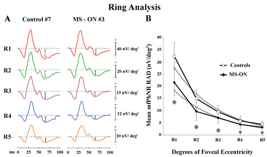 In Figure 2A, mfPhNR traces from one representative control (#7) and one MS-ON (#3) eye are reported for the five rings with increasing eccentricity from the fovea (from 0° to 25°).