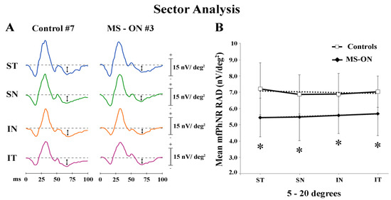 When mean values of mfPhNR RAD from four sectors in the 5°–20°, recorded in controls and in MS-ON eyes, were plotted as a function of retinal eccentricity, we observed that RAD values in MS-ON eyes were different from those of control eyes; however, in both groups, mean mfPhNR responses obtained from ST, SN, IN, and IT showed almost constant values but different trends (linear fitting: controls: r2 = 0.17; MS-ON: r2 = 0.96) (see Figure 3B).