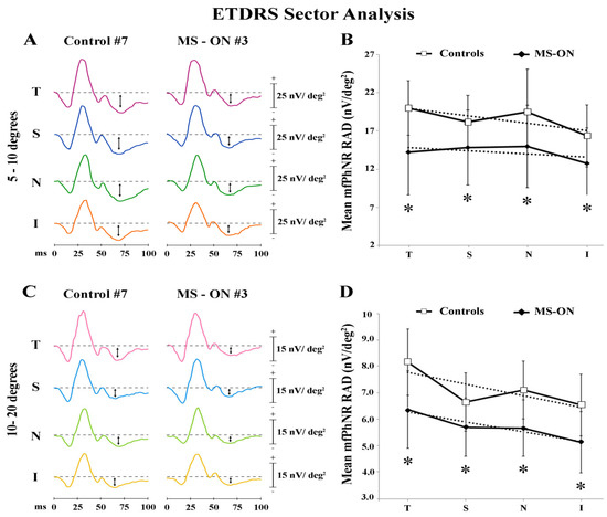 In Figure 4A,C, mfPhNR traces from one representative control (#7) and one MS-ON (#3) eye are reported for the five ETDRS sectors covering an area of 5°–10° of foveal eccentricity and for the four outermost ETDRS sectors covering an area of 10°–20° of foveal eccentricity, respectively.