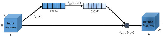 where z is the output from the squeeze operation, the ReLU activation, & are two fully connected (FC) layers, and is the sigmoid activation. The final output is obtained by multiplication of and the input layer. The squeeze and excitation operation is depicted in Figure 2.