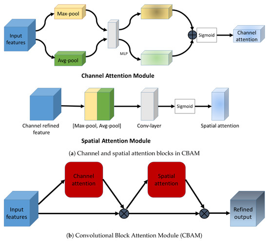 The CBAM’s channel attention [23] is calculated by squeezing the spatial dimension of the input feature map using average and max-pooling and then feeding them forward through a small multi-layer perceptron (MLP).