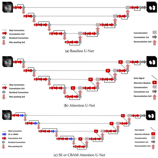 The network architectures for kidney segmentation: (a) baseline U-Net without any attention modules, (b) U-Net with attention modules as described by Oktay et al. [21] and (c) U-Net combining SE or CBAM [22,23] with attention modules from [21].