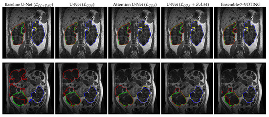 Examples of obtained segmentation after post-processing for each network are displayed in Figure 5. The top row depicts a case with a DSC of 0.96 (stage: 1, female, age: 34), where the two networks (U-Net () & Attention U-Net ()) surpass the baseline only by a DSC of ≈ 0.002. The lower row depicts the obtained segmentation from a case with a high load of cysts that are distributed not only in the kidneys but all over the abdomen (stage: 2, female, age: 32). We observe that every network has difficulties obtaining a DSC > 0.80. Nonetheless, the proposed networks outperform the baseline U-Net by up to 18% (U-Net ()).