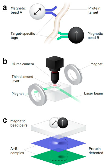 It is also noteworthy that quantum magnetic sensors can be configured for the detection of additional biomolecules. The clinical scenarios in which rapid, accurate point-of-care detection of specific biomolecules could result in improved patient management are numerous. For example, developing an assay that rapidly detects and quantifies procalcitonin, a biomarker of infectious diseases, in the emergency department (ED) setting can aid in the identification and management of patients with invasive bacterial infections versus viral lower respiratory tract infections [35,36]. Another example is the management of acute stroke—the second highest leading cause of death. The management of stroke classically relies on clinical assessment and neurological imaging methods, imposing a need for more time-sensitive techniques such as point-of-care tests capable of detecting specific stroke biomarkers such as B-type Natriuretic Peptide (BNP) for suspected ischemic stroke, neuron specific enolase (NSE), fibronectin for hemorrhagic stroke, and purines (e.g., adenosine, inosine and hypoxanthine) released after stroke onset [37,38,39,40]. Several novel assays are being developed and can potentially facilitate rapid acute stroke diagnosis assisting in efficient stroke triage and treatment [41]. Moreover, point-of-care testing may prove useful in managing bleeding complications following cardiac surgery. Using point-of-care tests that detect prothrombin time, activated partial thromboplastin time, fibrinogen, and platelet function can aid in clinical decision-making on coagulation interventions for bleeding complications more rapidly than standard laboratory tests [42].