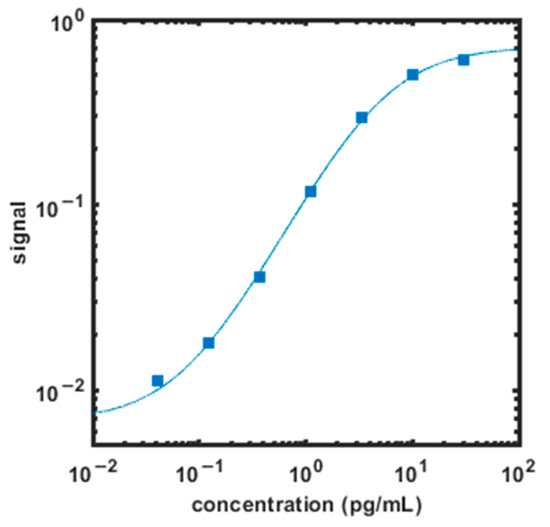 Example IL-6 assay calibration curve (squares). Assay signal is the fraction of beads contained in analyte-bound immunocomplexes. The solid line is a four-parameter logistic fit with 1/y2 weighting.