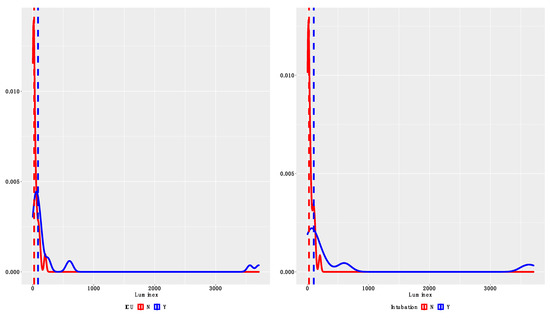 Distribution of QDTI10x, QDTI80x, and Luminex assay by ICU and intubation status. The dashed vertical lines represent median assay values. Y-axis represents density.