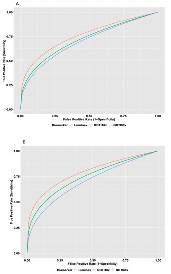Receiver operating characteristic (ROC) curves were used to assess the diagnostic performance of QDTI and Luminex assays for worsened patient outcomes. Two clinical parameters, specifically ICU admission and use of mechanical ventilation, were used as measures of poor clinical outcomes. Twelve patients (34%) were admitted to the ICU during their hospital stay (Table 4). Likewise, eight patients (23%) required invasive mechanical ventilation during their hospitalization (Table 4 and Table 5). Patients requiring mechanical ventilation were also admitted to the ICU, so these patients were used in the two ROC curve analyses. For each patient, we had 2–4 replicates, and hence we had 16–48 data points for the ROC curve analyses. Figure 4 displays the distribution of QDTI10x, QDTI80x, and Luminex assay by ICU and intubation status. As can be seen from Figure 4, patients admitted to the ICU and patients requiring mechanical ventilation had higher assay values. Figure 5 displays the ROC curves for QDTI10x, QDTI80x, and Luminex assay. Results from Figure 5 show comparable receiving operating characteristic curves (ROCs) for QDTI10x, QDTI80x, and the Luminex assay. For the Luminex assay, the area under the receiver operating curve was 0.76 (95% CI: 0.65–0.86), indicating that the Luminex assay correctly identified an ICU patient from a non-ICU patient 76% of the time. Similarly, QDTI10x and QDTI80x had a 72% (AUC = 0.72; 95% CI: 0.63–0.80) and a 70% (AUC = 0.70; 95% CI: 0.62–0.78) probability of correctly distinguishing an ICU patient from non-ICU patient, respectively. Although the overall diagnostic accuracy of the Luminex assay was higher, there were no statistically significant differences between the ROC curves of the three assays (Figure 5A). The results for mechanical ventilation were similar, as shown in Figure 5B. More specifically, the areas under the ROC curve were 0.79 (95% CI: 0.64–0.90), 0.74 (95% CI: 0.64–0.83), and 0.70 (95% CI: 0.58–0.80) for Luminex, QDTI10x, and QDTI80x, respectively. As was the case with ICU admission, the overall diagnostic accuracy of the Luminex assay was higher, but there were no statistically significant differences between the performances of the three assays.