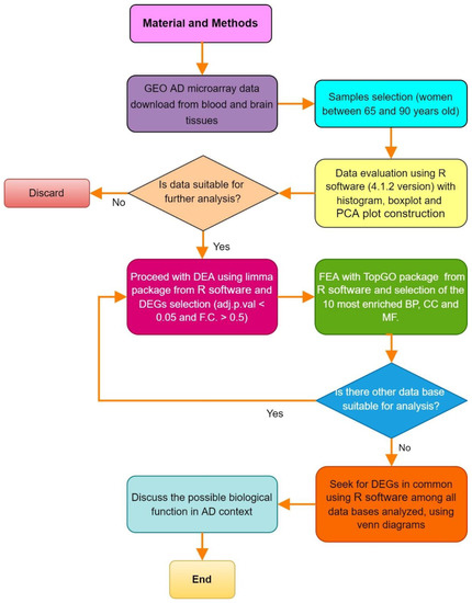 In this work, all analyses were carried out in January 2022 with R version 4.1.2. First, we analyzed free-access microarray databases from the Gene Expression Omnibus (https://www.ncbi.nlm.nih.gov/geo/, accessed on 22 March 2022) from affected human blood (GSE4226, GSE63061, GSE85426, GSE97760, GSE140829, GSE18309) and brain areas (GSE132903, GSE118553, GSE110226, GSE84422, GSE28146, GSE33000, GSE48350, GSE4757, GSE39420) with sporadic Alzheimer disease. We only selected databases in which gene expression showed normal distribution in the histogram, similar a median across all samples in boxplot, and with AD samples and healthy samples grouped apart or with a tendency to separate in PCA plots. For further analysis, we worked with only female samples between 65 and 90 years old to reduce variability (Table 1).