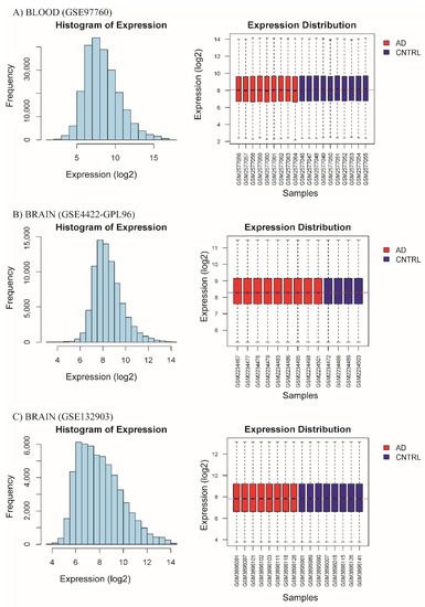 Homogenization of data, distribution histogram of logarithmic-scale expression after processing data, and Tukey diagrams with expression value distribution in a logarithmic scale of each subject in both groups (CNTL and AD). Data of (A) blood tissue from database GSE97760, (B) brain tissue from database GSE84422-GPL96, and (C) brain tissue from database GSE132903.
