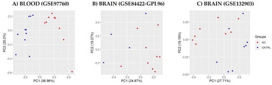 Principal component analysis (PCA) of processed data (CNTL and AD). Data of (A) blood database GSE97760, (B) brain database GSE84422-GPL96, and (C) brain database GSE132903.
