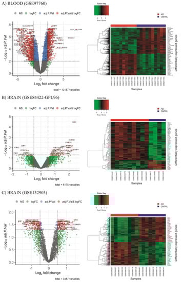 Volcano plot of up- and downregulated differentially expressed genes (DEGs) when comparing Alzheimer’s disease (AD) samples with healthy control samples (CNTRL), and heat map with logarithmic scale expression of DEGs in AD and CNTRL samples. CNTRL in blue, AD in red, purple line = median value, principal component 1, Dim1; principal component 2, Dim2; not significant, NS; genes with −0.5 > fold change < 0.5 (green dots); genes with −0.5 > fold change < 0.5 and adjusted p value (adj.P.val) < 0.05 (red dots). Data of (A) blood GSE97760, (B) brain GSE84422-GPL96, and (C) brain GSE132903.